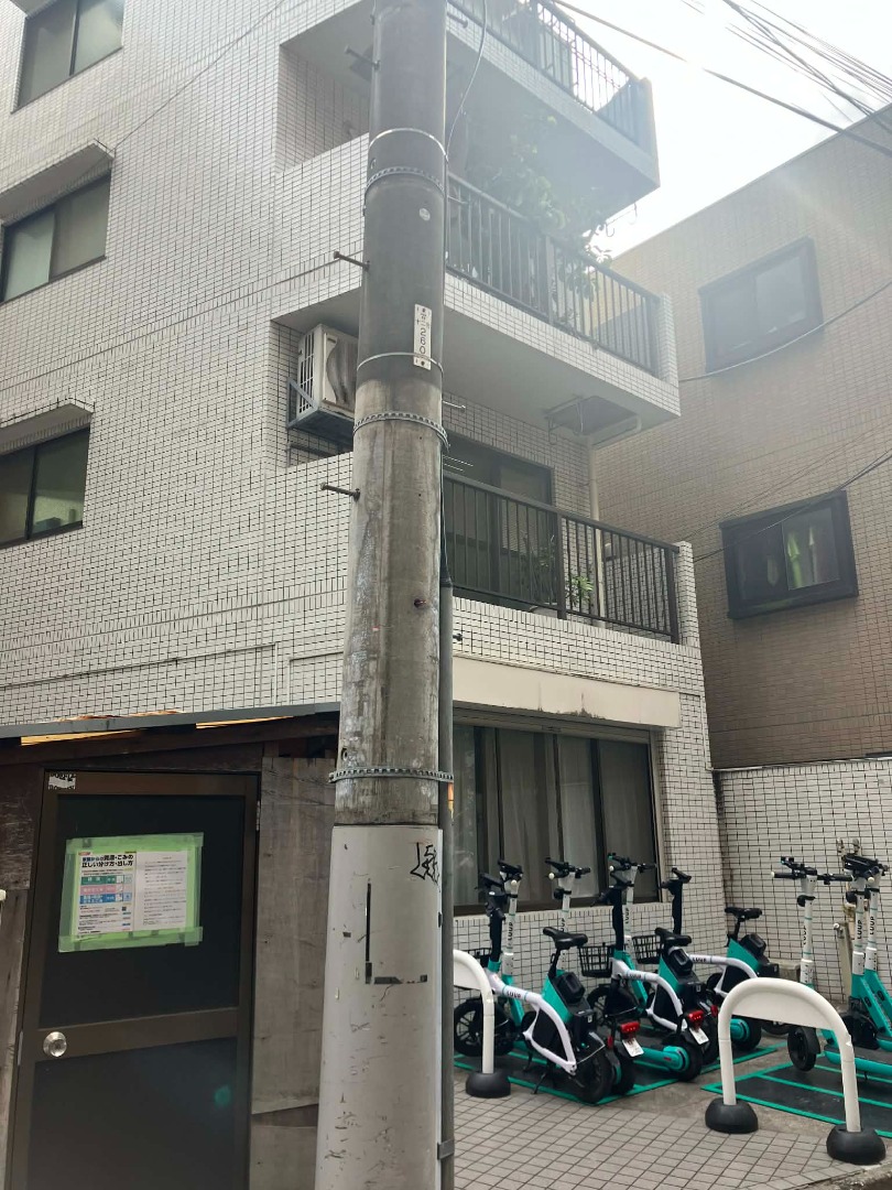 突き当り右斜め方向にレンタルサイクル(緑色)が設置されているマンションです。